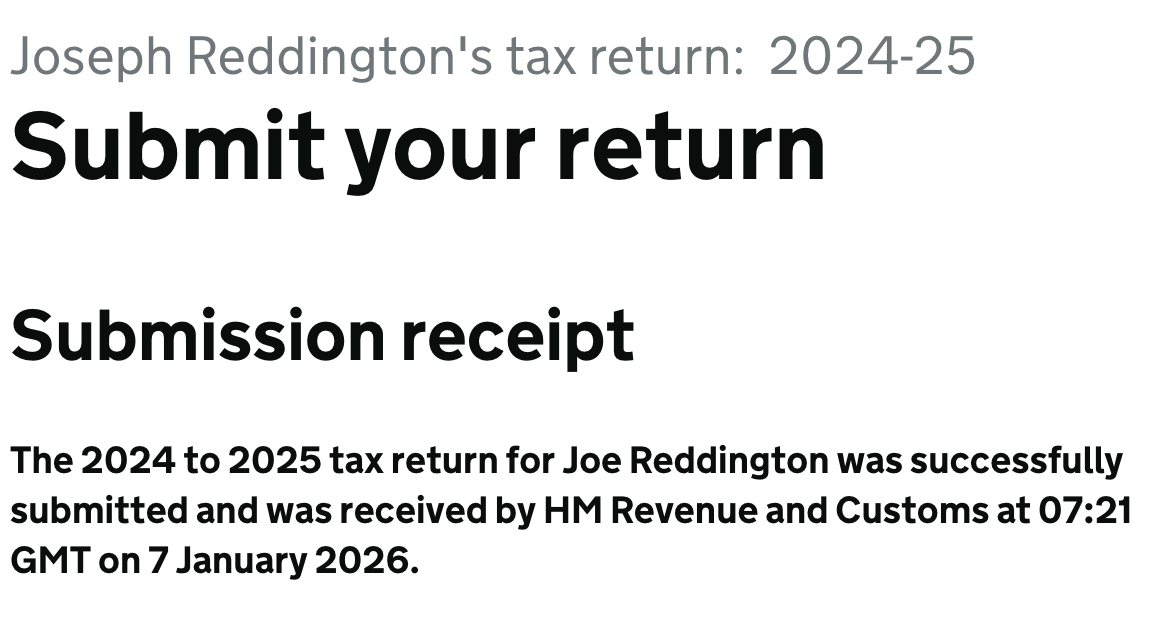 Self-assessment Jan 7, 2026 I have just filled out my self-assessment tax form: It was fairly brutal (particularly now I’m working full time), but it’s a chance to take stock a little bit.
